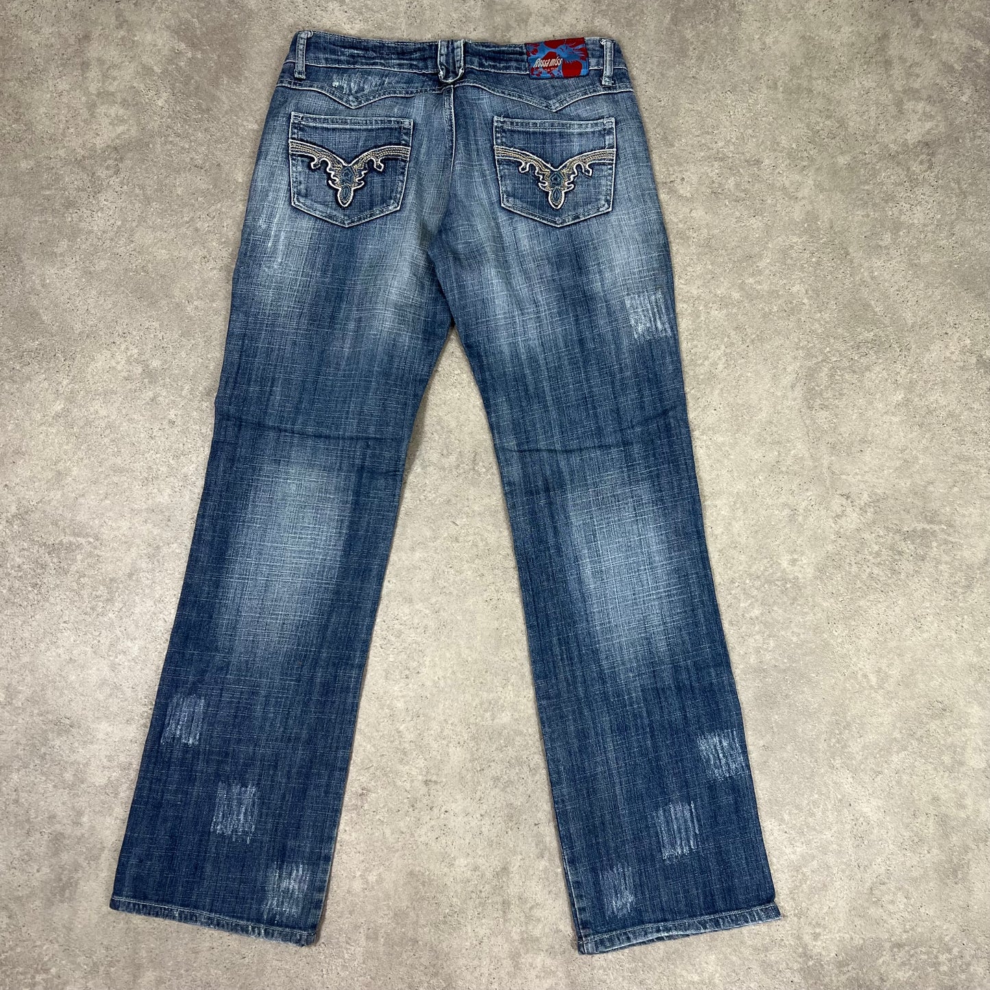 True vintage 90s y2k denim baggy jeans with distressed features and embroidery