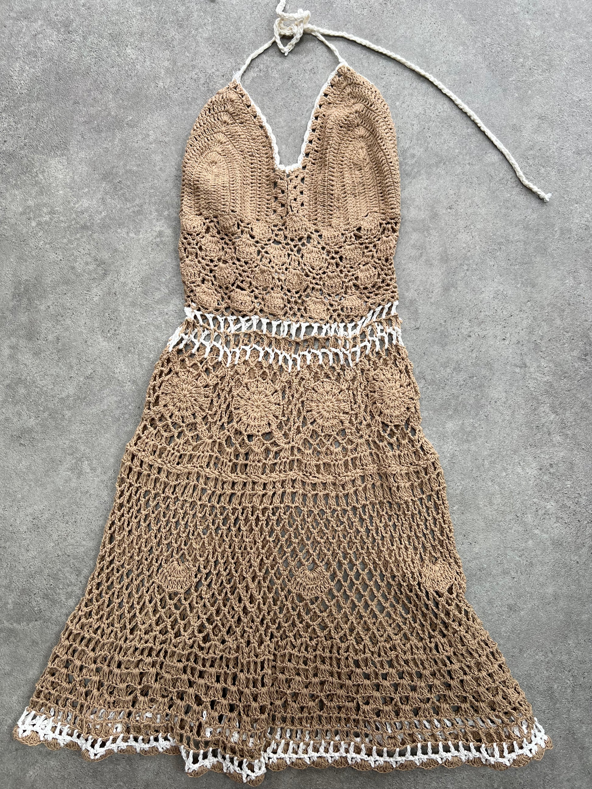 90s Brown Crochet Halter Neck Dress - Size S/M